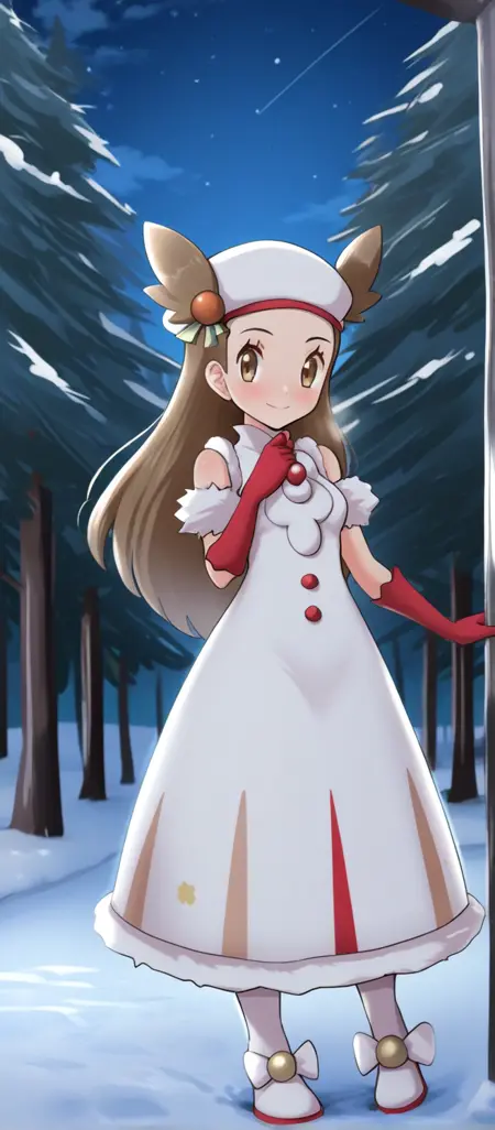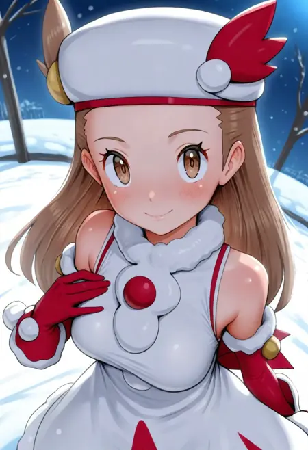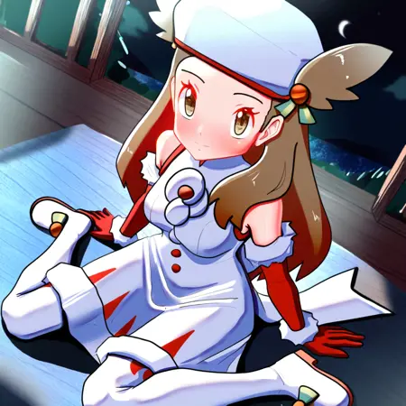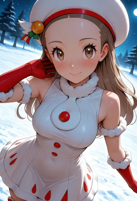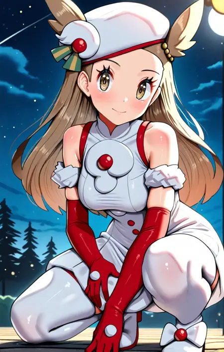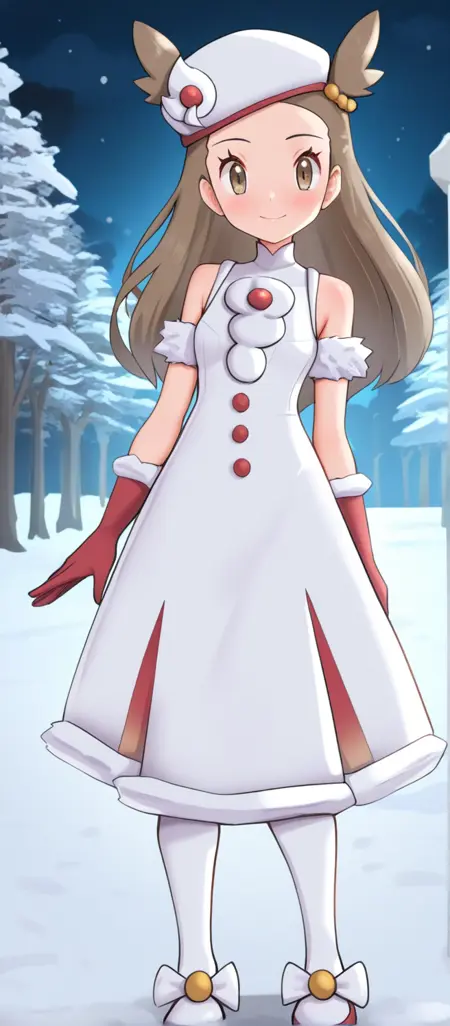 ヘアアクセサリー、帽子、白い頭部装飾、ノースリーブドレス、白いドレス、ロングドレス、ボタン、ファーの腕輪、赤い手袋、ポンポン(服)、太もも長のブーツ、靴のリボン、白い靴