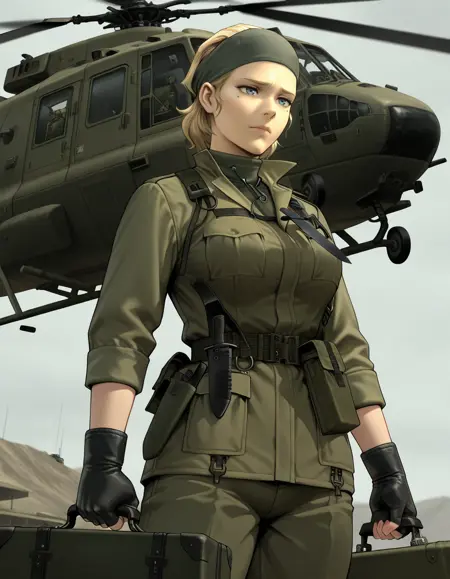 1girl, mature, blue gray eyes, mole under eye, blonde hair, hair pulled back, medium breasts, bandana, green military uniform, knife holster on chest, black gloves, fingerless gloves, black boots