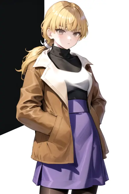 KarinSauer, 1girl, solo, long hair, blue skirt, blonde hair, black shirt, long sleeves, brown eyes, brown jacket, low ponytail, black pantyhose, blunt bangs, turtleneck, purple skirt