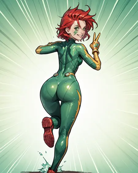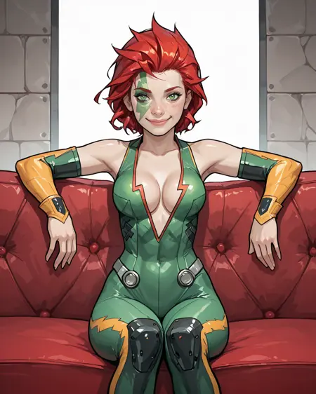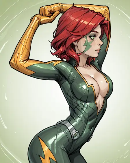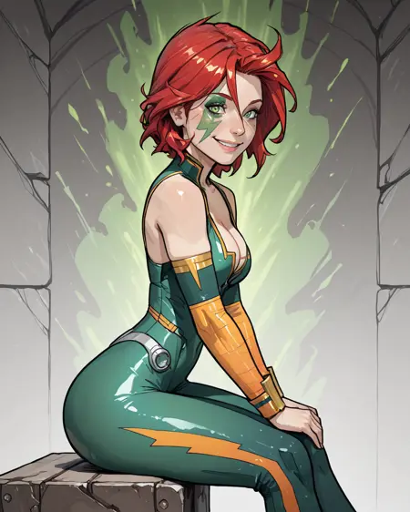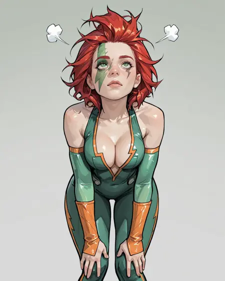 트리거: carintaylor, 빨간 머리, 백혈병 피부, 얼굴 문신, 바디수트, 흉부 노출, 초록색 눈