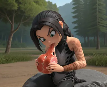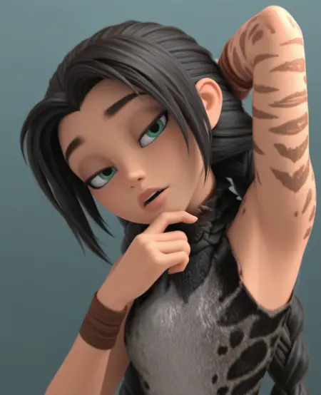 db1, 1girl, black hair, green eyes, sidelocks, fur shirt, sleeveless, twin braids, cavewoman, animal print, single arm tattoo, wristband, waistband, pants, fur boots