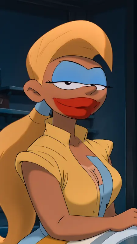 VonDeBlotz, 1girl, breasts, large breasts, long hair, red lips, blonde hair, ponytail, blue hair ribbon, cleavage, blue short jumpsuit, blue eyeshadow, tan, hard nipples,