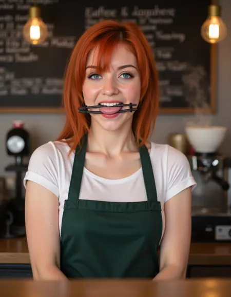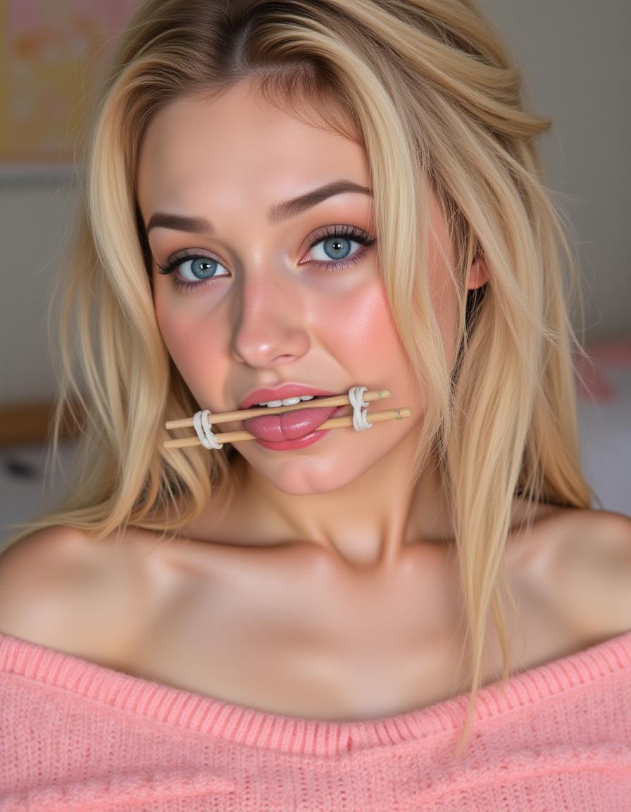 Using the wording "Gagged a (Colour) chopstick gag with (Colour) bands clamped on her tongue and holding it out of her mouth " gets the best results