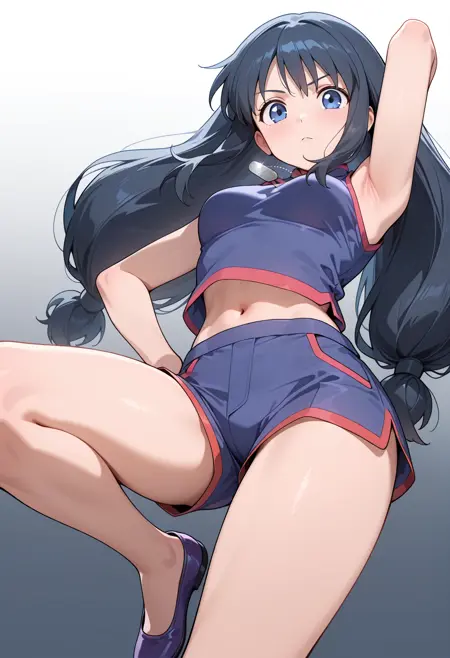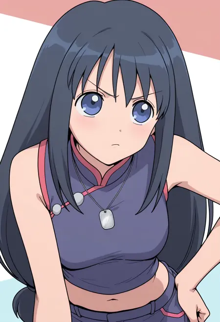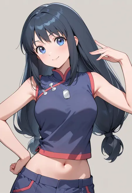 blue chinese clothes, sleeveless, dog tags, navel, blue shorts, purple chinese shoes