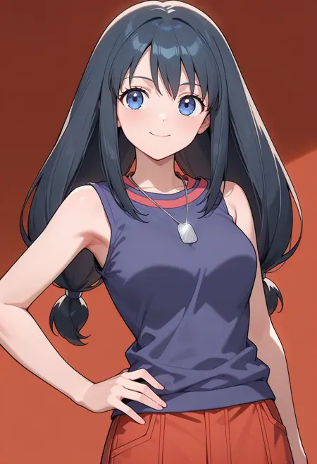 blue sleeveless shirt, dog tags, red skirt, sandals