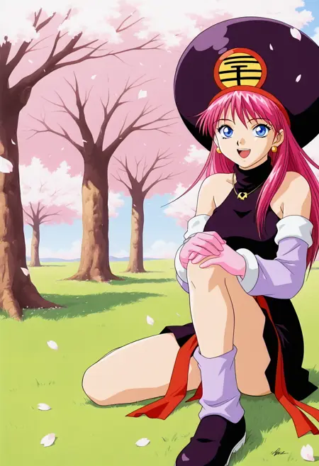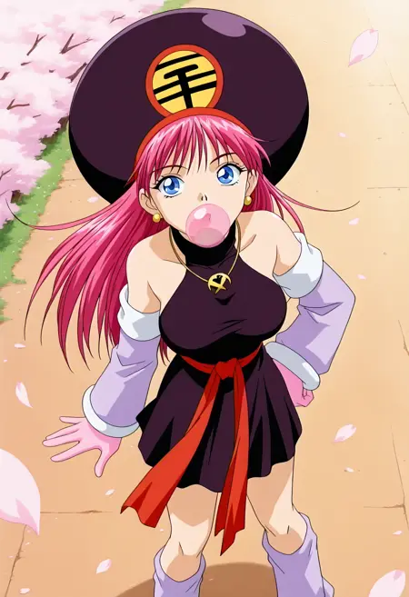mion、1girl、シングル、長い髪、観覧者を見つめる、青い目、手袋、帽子、裸の肩、ジュエリー、上半身、ピンクの髪、分離された袖、ノースリーブ、肘まである手袋、ネックレス、タートルネック、腕を組む、ペンダント、階段、生物、レトロなアートスタイル、2000年代(スタイル)、ピンクの手袋