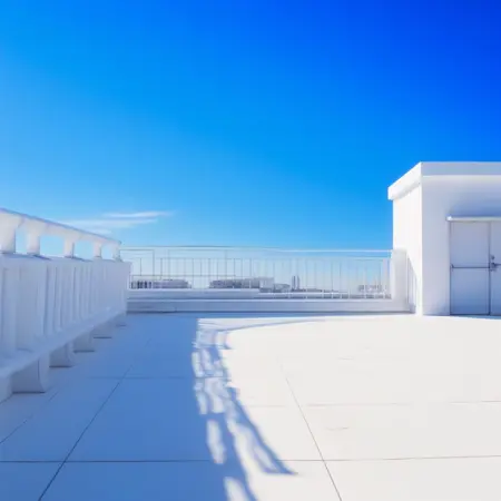 cloud, day, air conditioner, outdoor unit ,white building ,ladder ,bench, twilight ,sunset ,sky ,star \(sky\) ,starry sky ,night,cityscape, fence,
