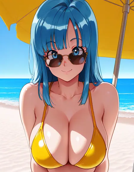1girl, solo, blue hair, blunt bangs, blue eyes, long hair, smile, large breasts, cleavage, eyelashes, yellow swimsuit, sunglasses
