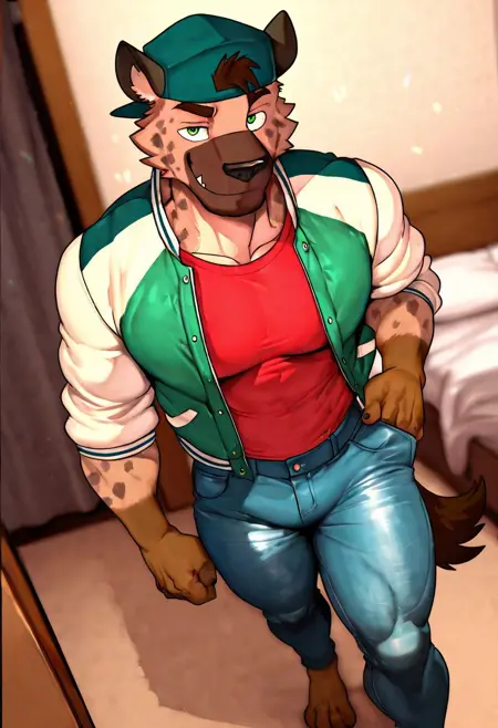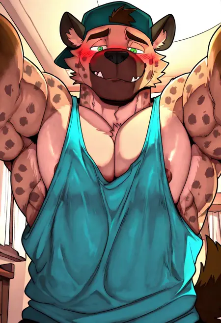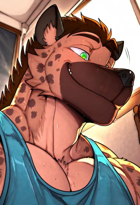 强化提示词: "鬣狗男孩,毛茸茸,尾巴,短发,绿眼睛,肌肉发达,阳刚, bara,宽阔胸肌"