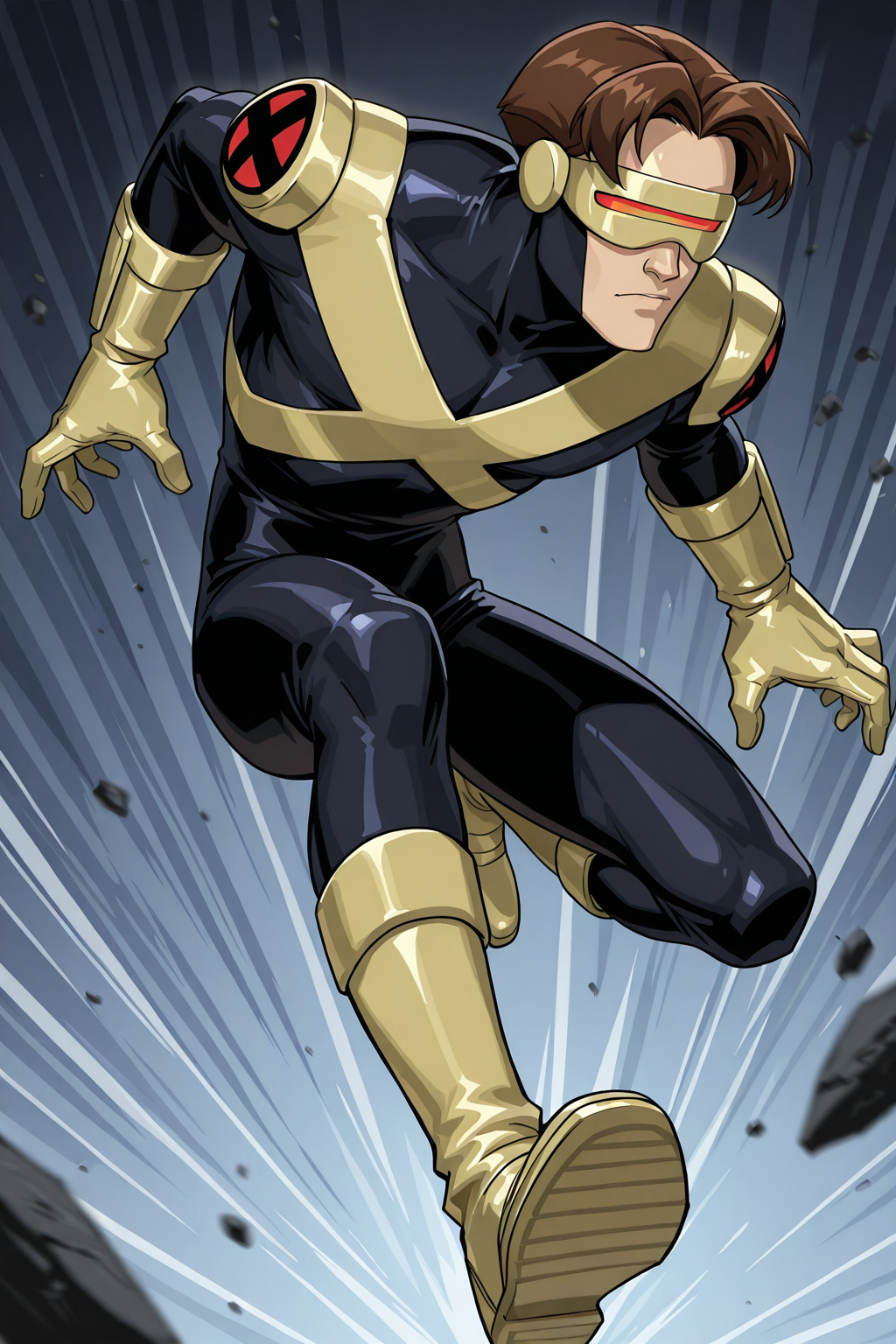 brown hair, xmen_uniform, black bodysuit, yellow visor, yellow gloves, x on chest, x-men symbol, yellow boots