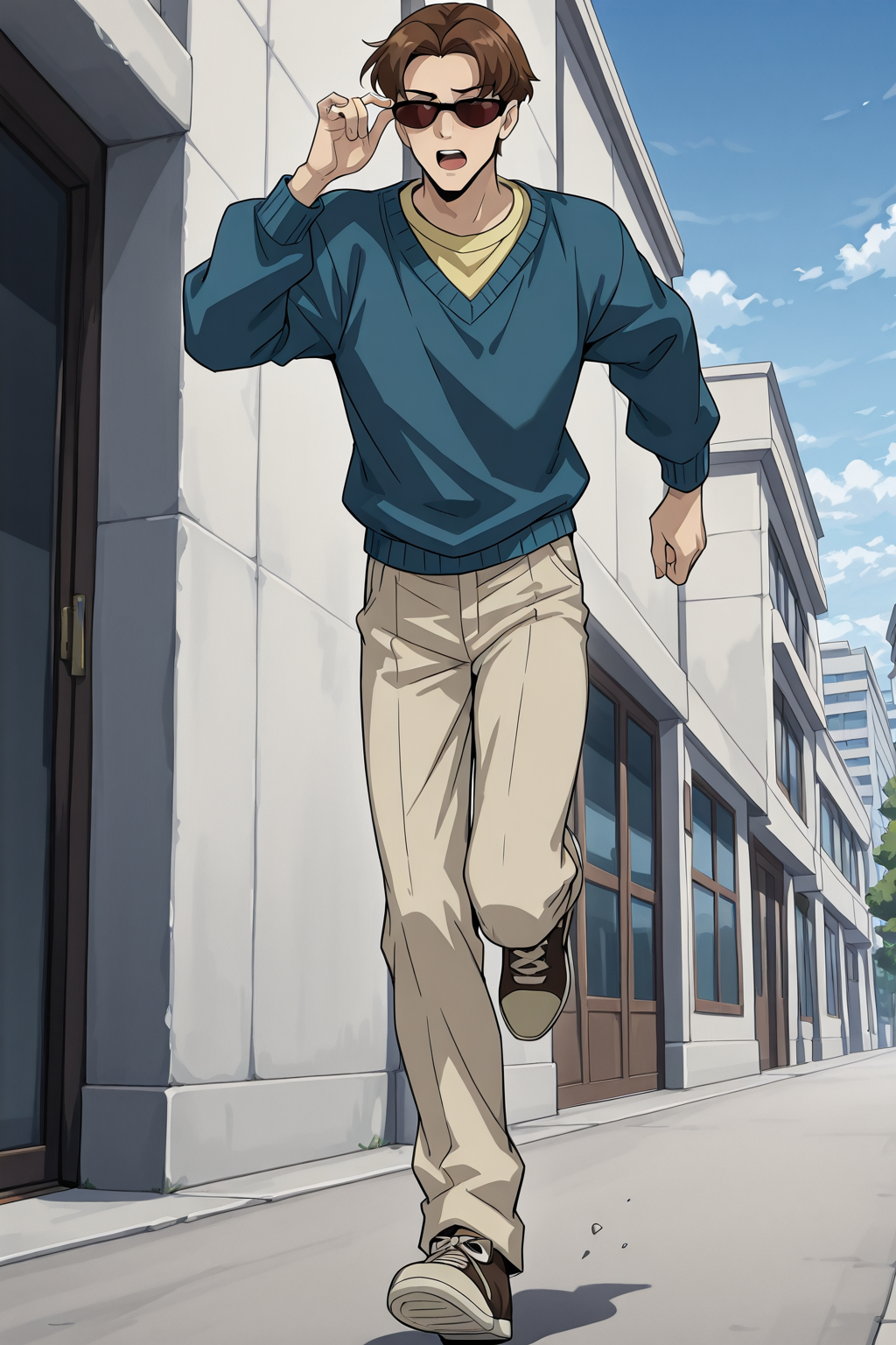 brown hair, sunglasses, casual_outfit, blue sweater, yellow shirt, beige pants, brown shoes