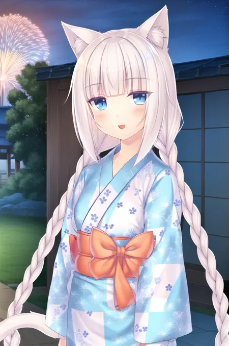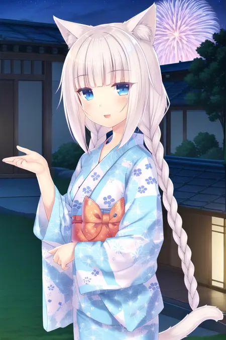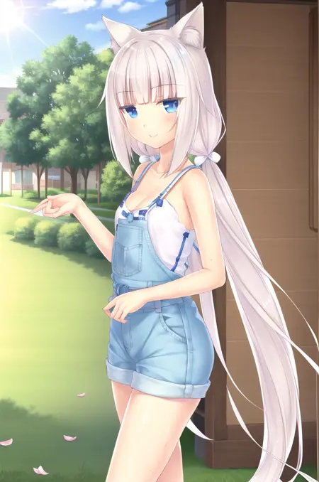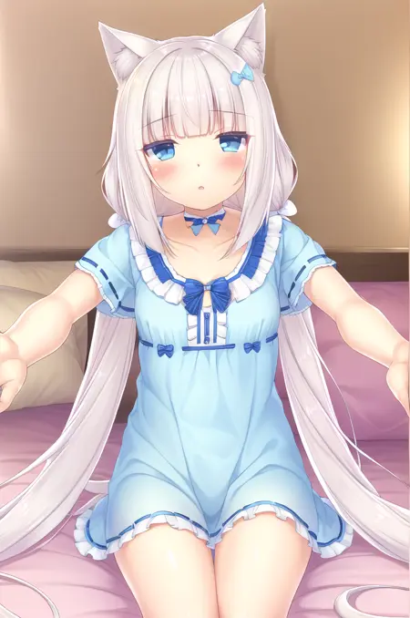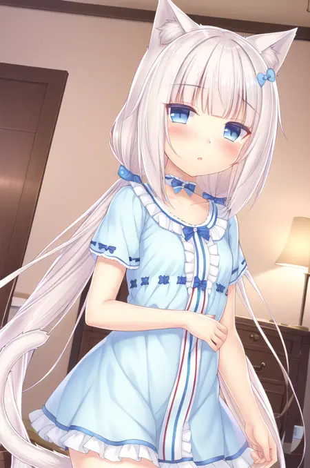 <lora:NekoparaVanilla-v1-07:0.6>, ChopioVanilla, 흰 머리, 긴 머리, 매우 긴 머리, 낮은 트윈테일, 둔한 앞머리, 고양이 귀, 동물 귀 털, 고양이 소녀, 파란 눈, 수직 동공, (고양이 꼬리:1.3), (시청자 바라보기:1.3),