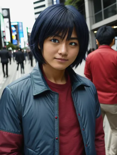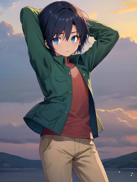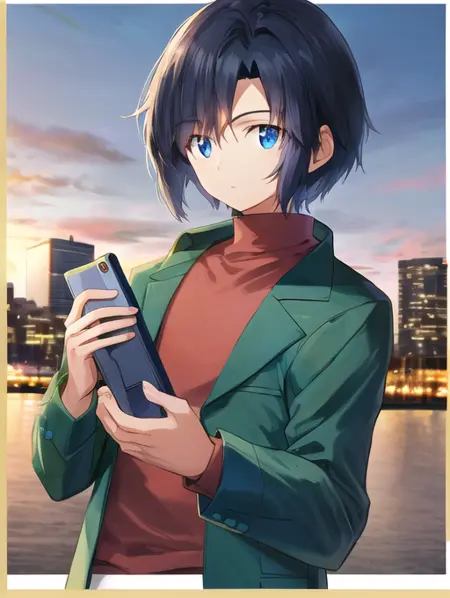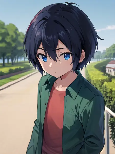 追加で役立つ言葉:濃紺の髪、青い目、緑のジャケット、赤いシャツ