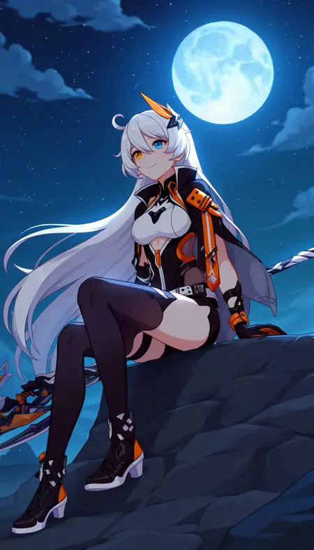 kiana VD, 1girl, 白发, 蓝眼, 长发, 异色瞳, 黄眼, 头发遮住眼睛, 发饰, 天线辫, 极长发, 黑色手套, 黑色夹克, 过膝袜, 中等胸部, 不对称袜子,