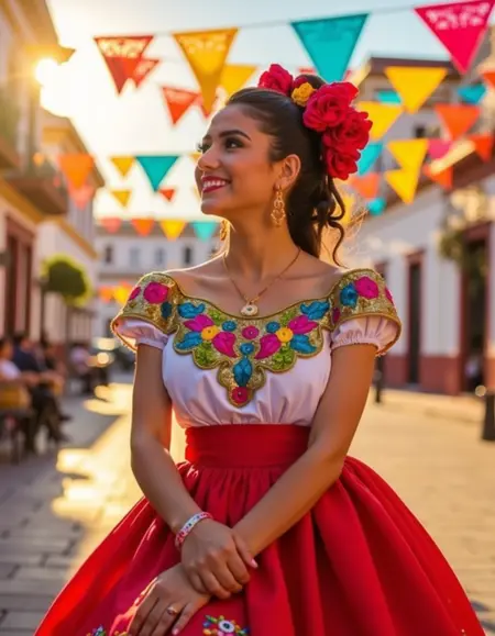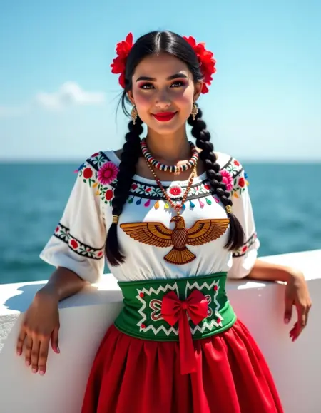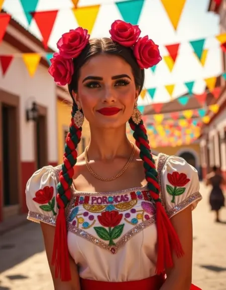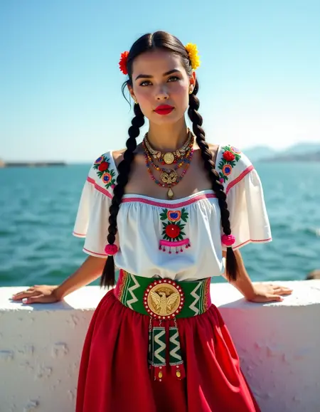 此外,中国波布拉纳风格常搭配编发发型,点缀着彩色丝带和花朵,展现出墨西哥女性的艺术与优雅。这一风格不仅是墨西哥身份的视觉体现,更是对国家多元遗产的致敬,常出现在民间舞蹈、节日和庆典中。
