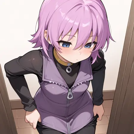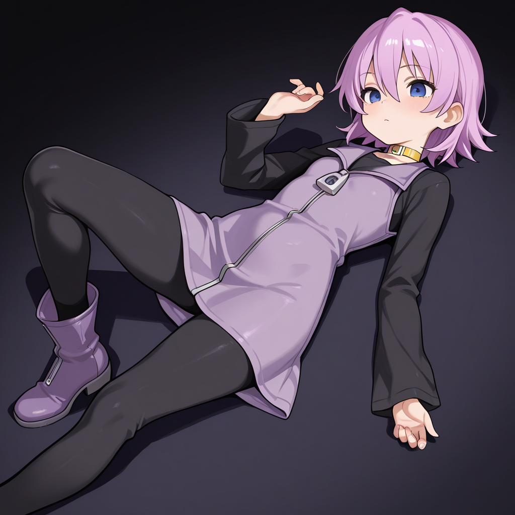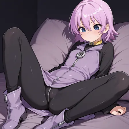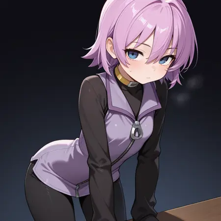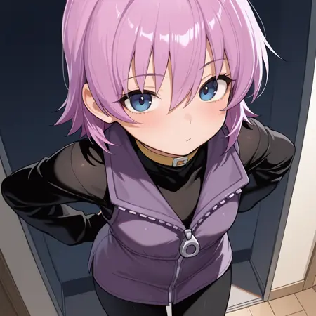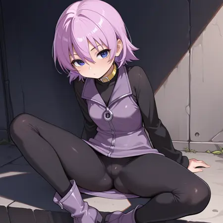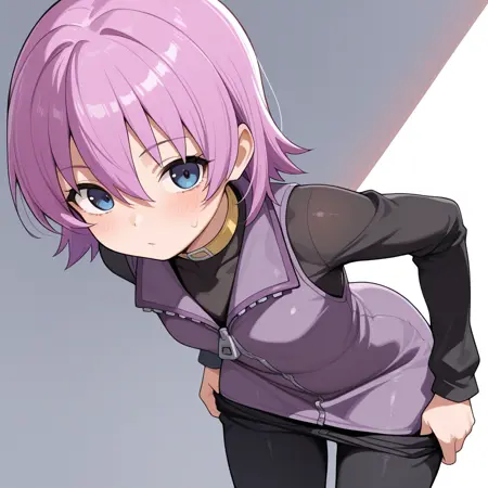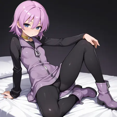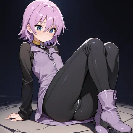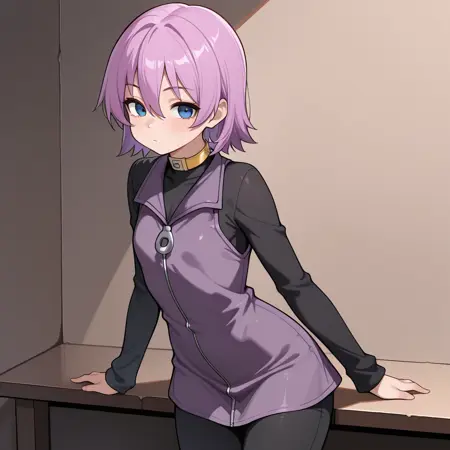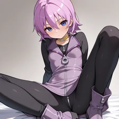 nanako, short purple hair, hair between eyes, smokey blue eyes, black long sleeve zipper shirt, purple zipper vest dress, black pants, yellow choker, purple zipper boots