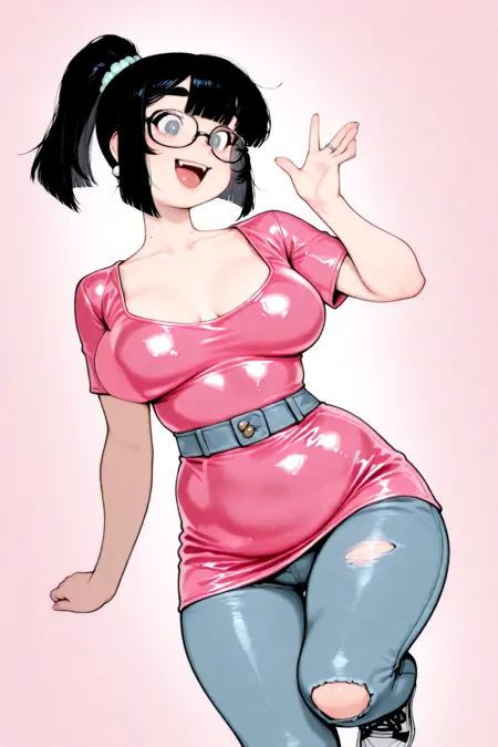 부드러운 몸매, 자연스러운 몸 proportions, 검정색 머리카락, 비대칭 볼륨 컷, 부드러운 배 곡선,