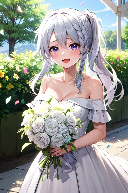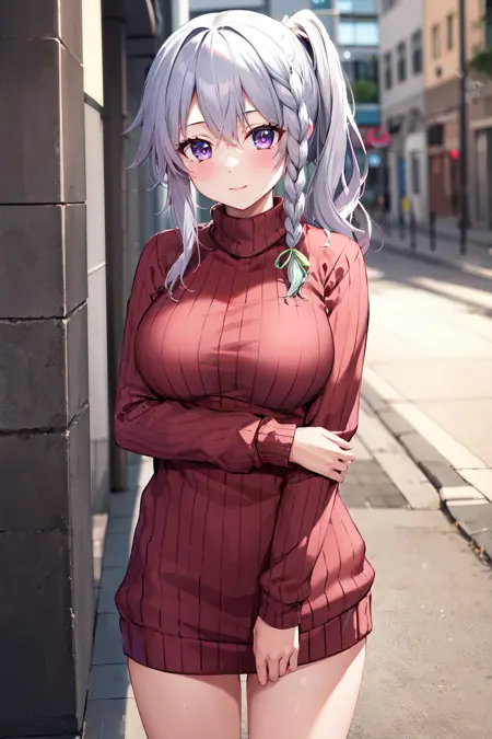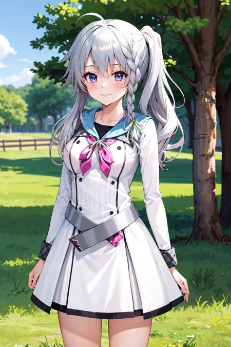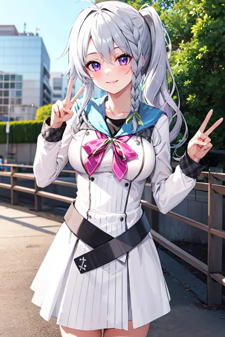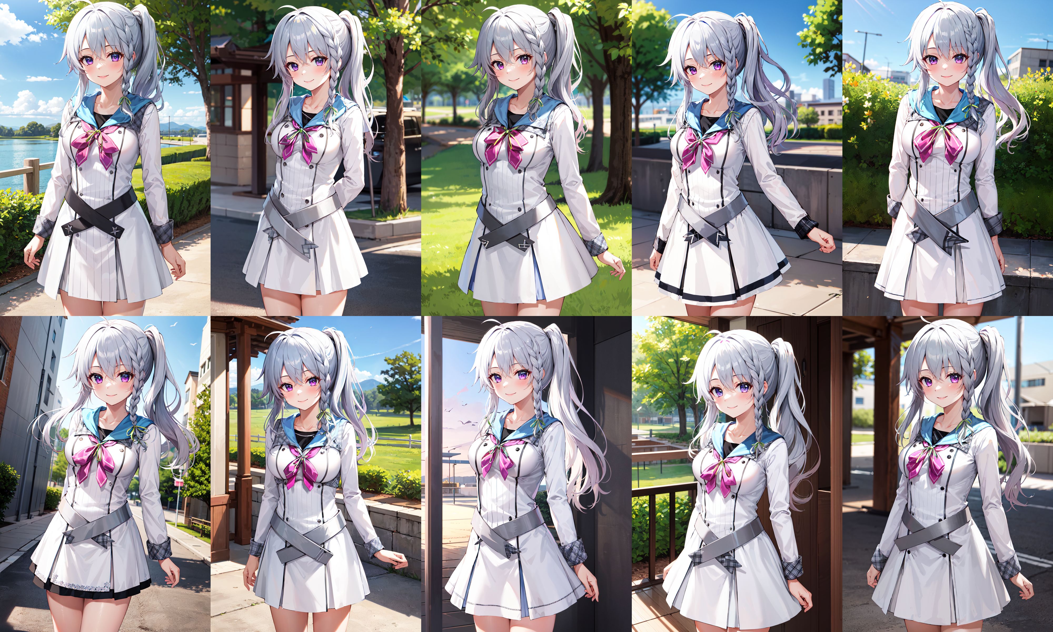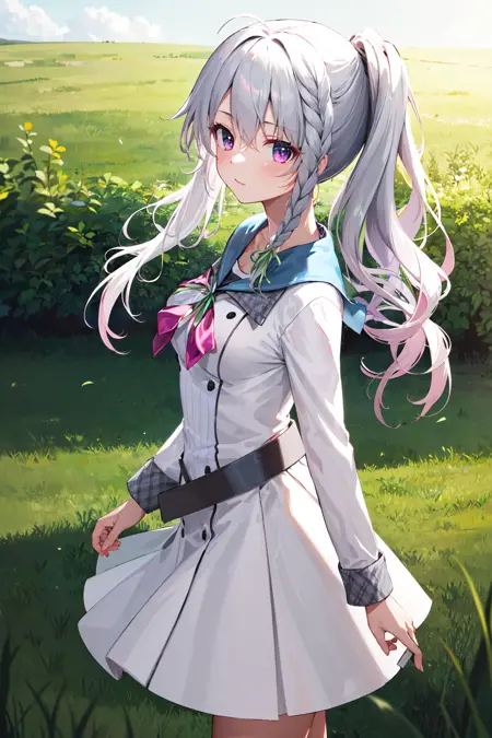 outfit1aasora, braid, long hair, side ponytail, hair ribbon, school uniform, sailor collar, pink bow, white shirt, long sleeves, belt, white skirt
