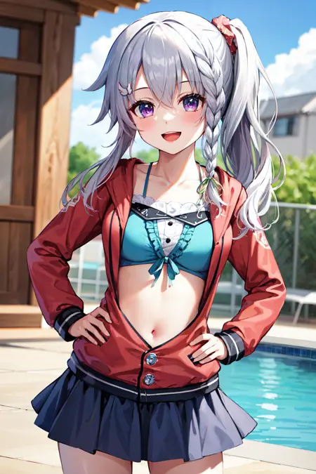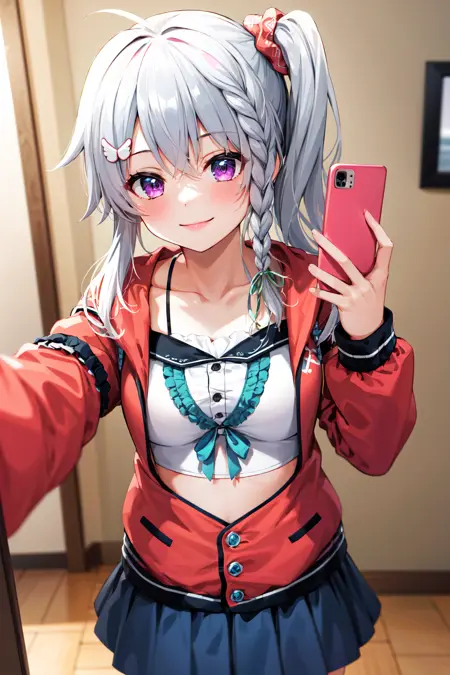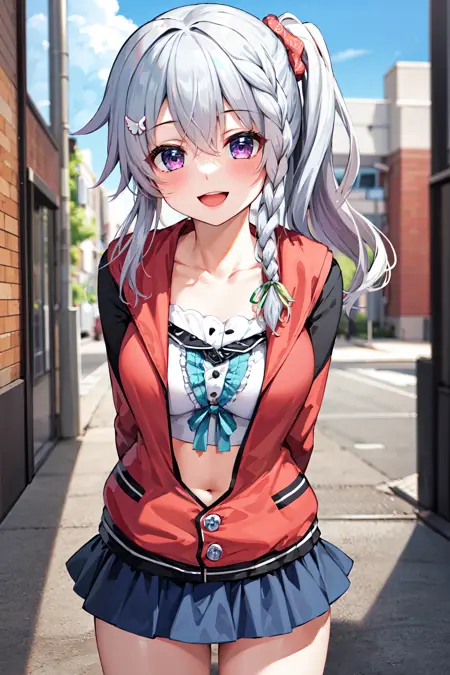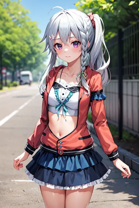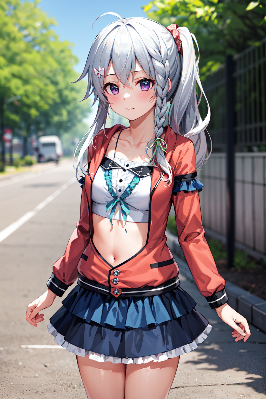 outfit2aasora, braid, long hair, side ponytail, hair ribbon, hair ornament, collarbone, crop top, frills, red jacket, long sleeves, blue skirt