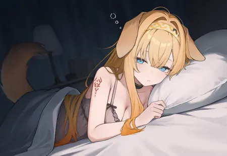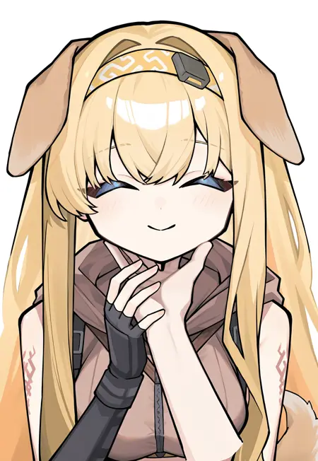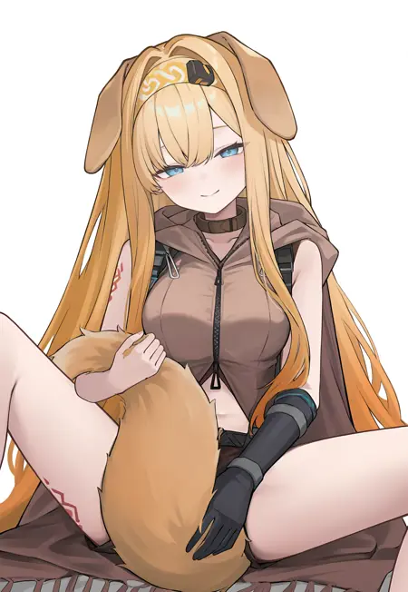 brigid (arknights),blonde hair,hair intakes,very long hair,gradient hair,blue eyes,dog ears,dog tail,medium breasts,shoulder tattoo,leg tattoo
