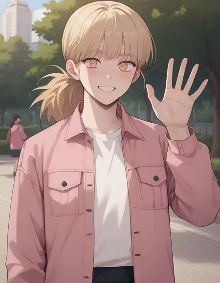nari im, 1girl, solo, yellow eyes, long hair, blonde hair, bangs, ponytail, long sleeves, open jacket, white shirt, pink jacket,