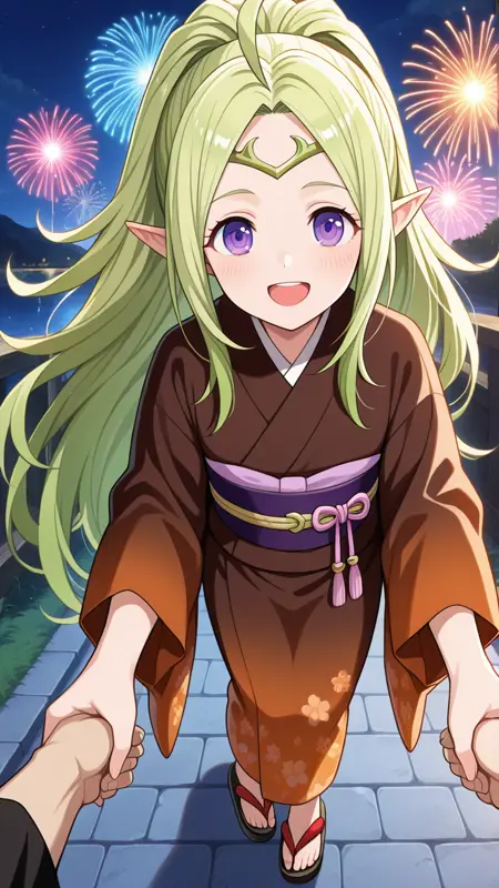 nowi (fire emblem), green hair, blonde hair, long hair, very long hair, parted bangs, purple eyes, ahoge, pointy ears, ponytail, high ponytail, tiara, circlet, sidelocks, gradient hair,