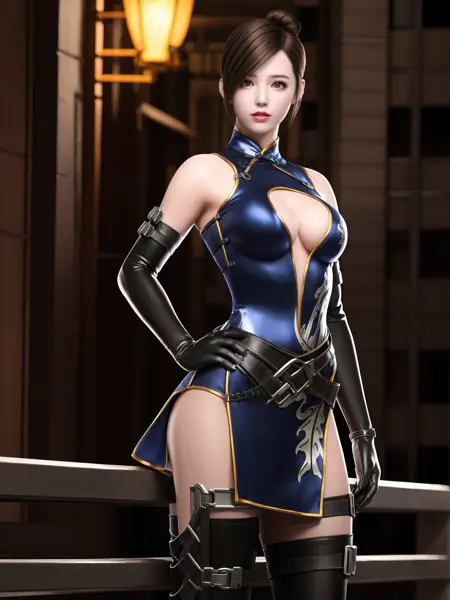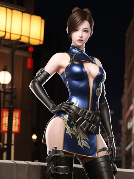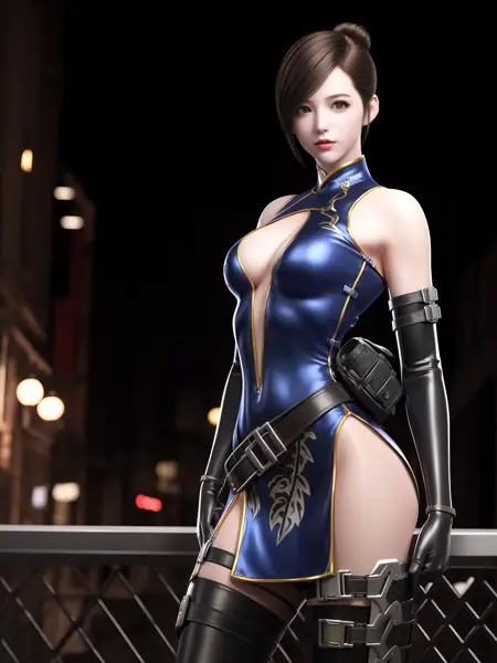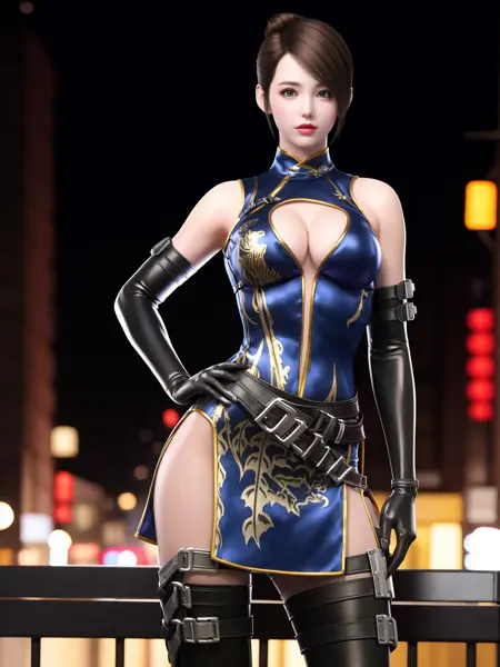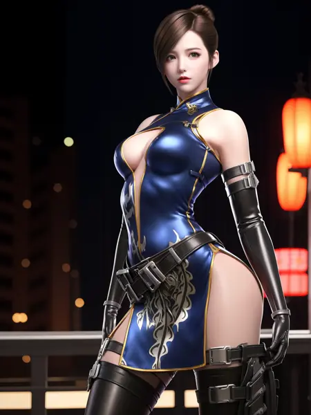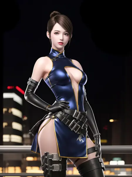 - CFhudieBW, 1girl, solo, elbow gloves, breasts, brown hair, boots, medium breasts, cleavage cutout, belt, holster, bare shoulders, black thighhighs, looking at viewer, short hair, china dress, cowboy shot, hand on hip, cityscape, night, mature female, single hair bun,