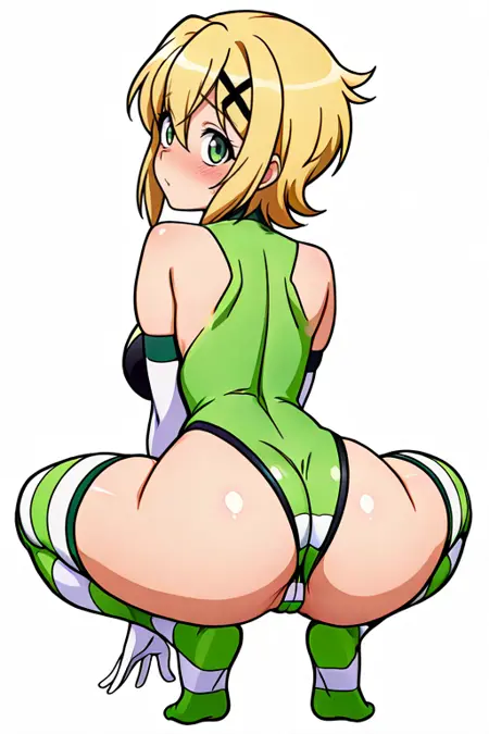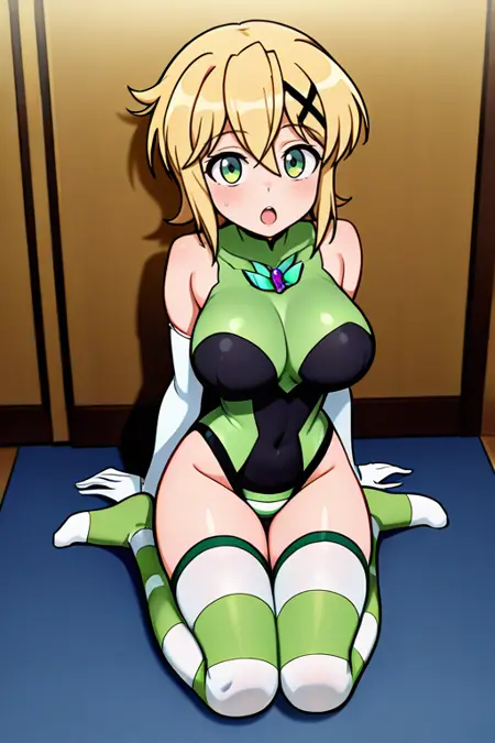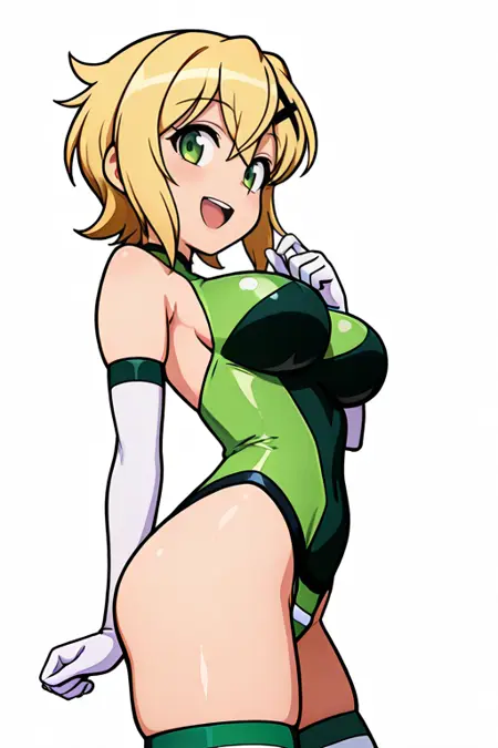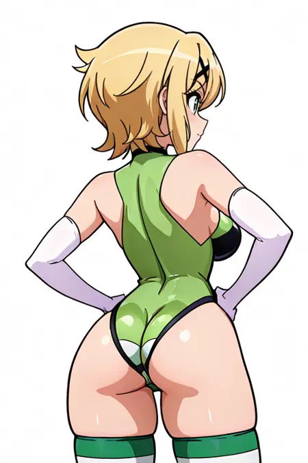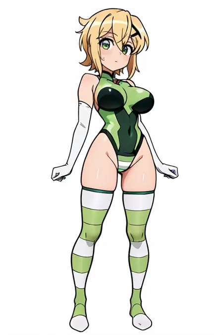 중간 크기의 가슴, kirikadef, 레오파드, 녹색 레오파드, 팔꿈치 장갑, 흰색 장갑, 줄무늬 허벅지 양말, 줄무늬 옷, 꼭 맞는 착용감