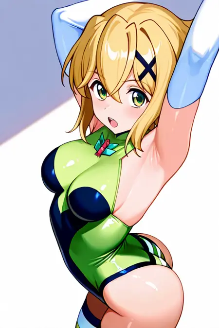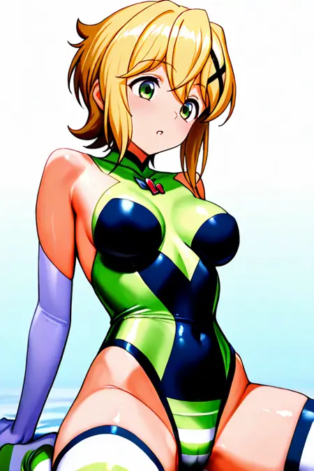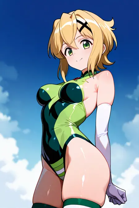 1girl, solo, hdkirikagi, short hair, blonde hair, x hair ornament, green eyes, shiny skin,