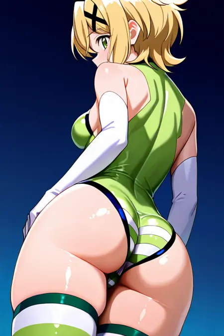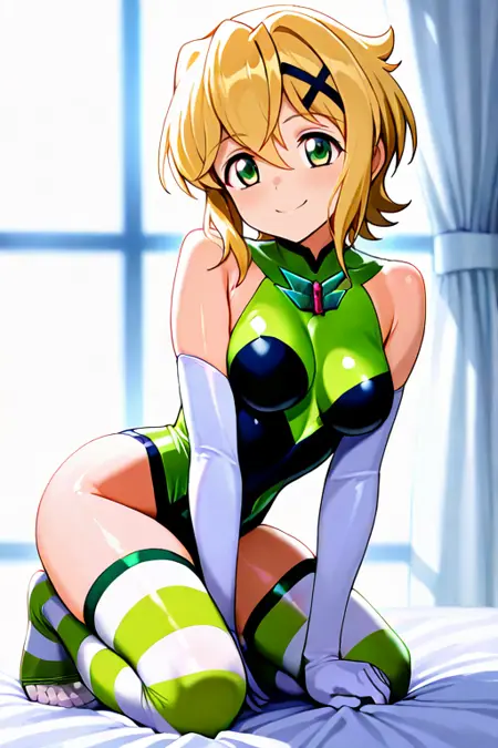 medium breasts, kirikadef, leotard, green leotard, elbow gloves, white gloves, striped thighhighs, striped clothes, skin tight,
