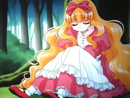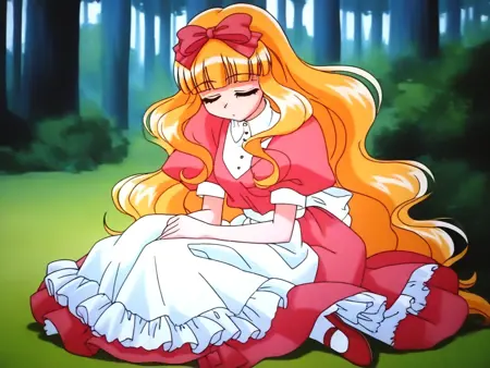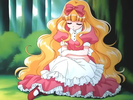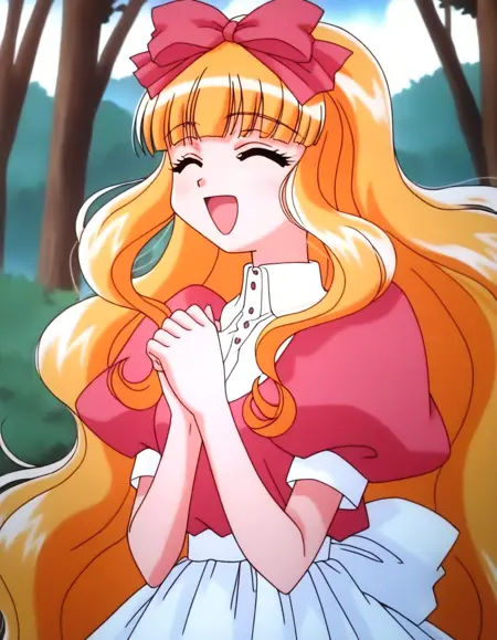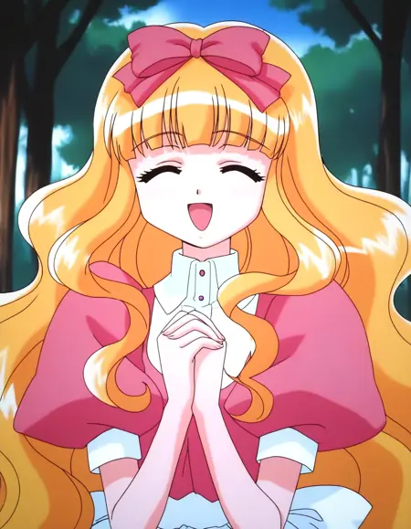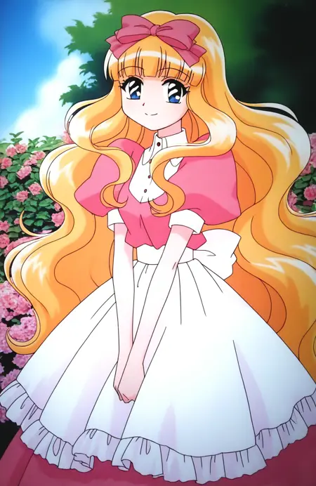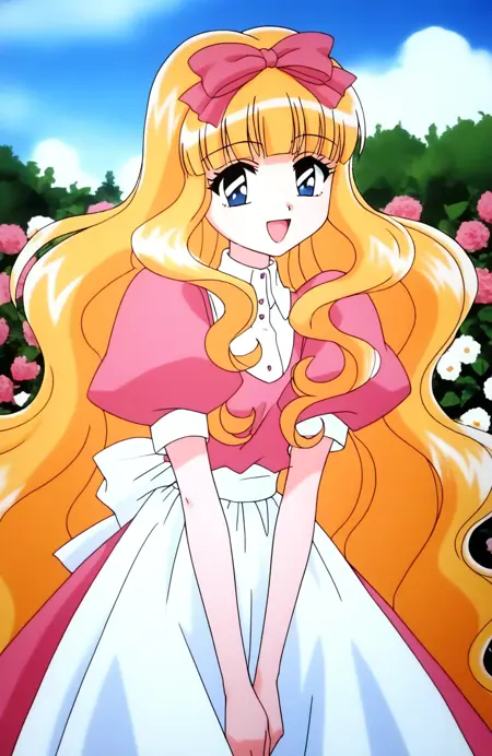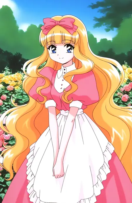 Alice(Alice_SOS) , 1girl, solo, very long hair, blonde hair, hair bow, blue eyes, bangs, wavy hair, 1990s (style),