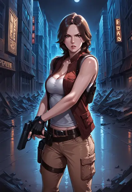 China - Shirt, sleeveless, tank top, cleavage, midriff, cargo pants, fingerless gloves, belt, shoulder holster, thigh holster, knee boots,