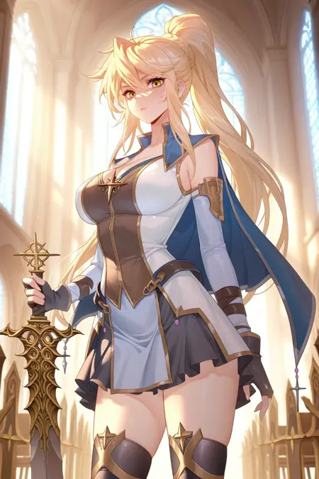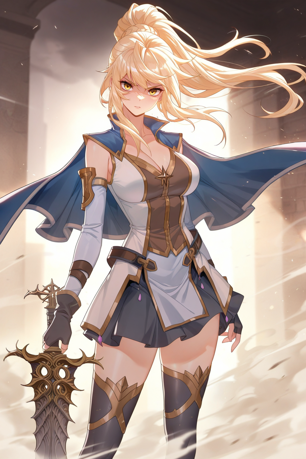Jiangqinge, yellow eyes, blonde hair, ponytail, blue cape, white shirt, black skirt, detached sleeves, fingerless gloves, black thighhighs