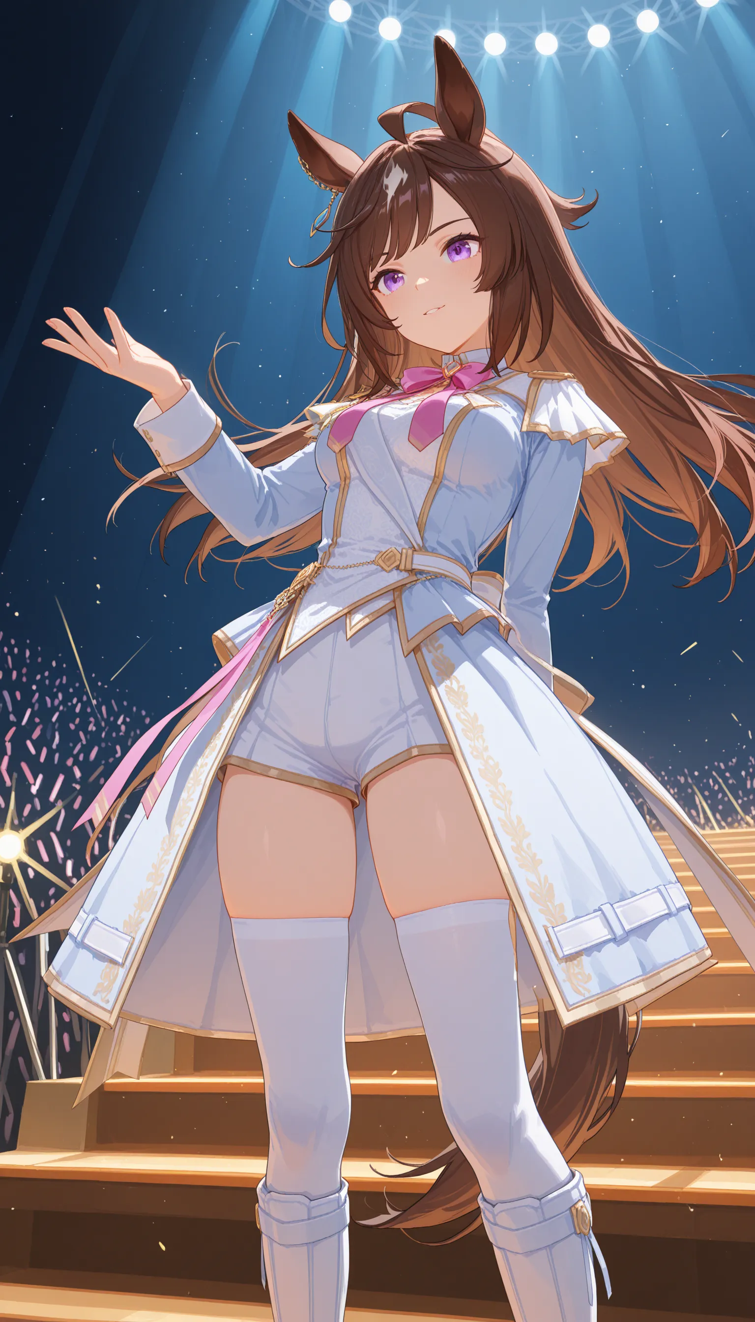 alternate costume, snowy integrity, long sleeves, jacket, knee boots, white footwear, skirt, white shorts, bowtie, white thighhighs,