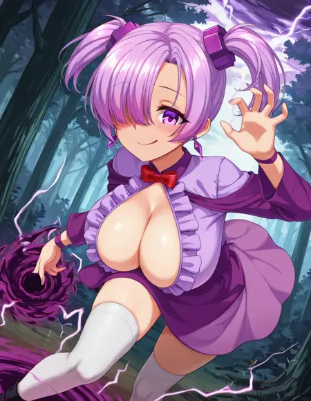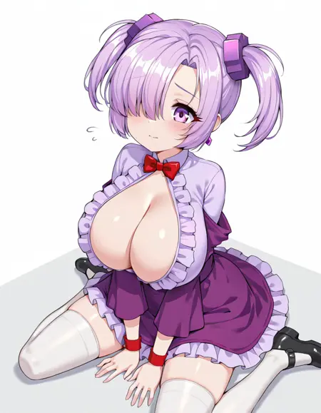 プロンプトワード: Pure_Dark、パープルの髪、パープルの目、白いスリーブレッグ、前髪、片方の目に髪を垂らす、パープルのスカート、大きな胸、胸元、短いツインテール、フリル付きのパープルのドレス、赤い蝶ネクタイ、パープルのジュエリーアクセサリー、パープルのプラスチックのスクランチ、シャツ、黒い踝履物、パープルの袖、1本の細い赤い手首の紐、