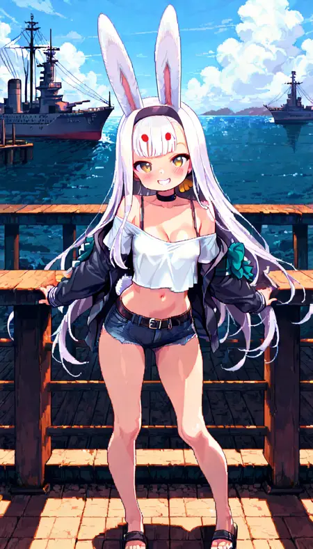 彼女のデフォルト衣装を最も正確に再現したプロンプトは以下の通り:ShimakazeIL, 黄色い目, 白髪, バニーエア, 長い髪, 黒いスカート, プリーツスカート, ジャケット, 長袖, 肩出し, オフショルダー, チョーカー, 腕リボン, アンダーブスト, 高ウエストの下着, 白いトップス