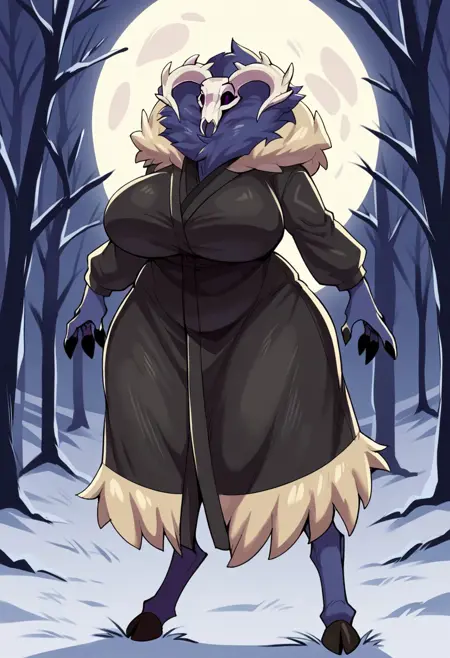 Lavender_Wendigo, female furry, female wendigo, anthro, tall female, deer skull, horns curved downwards, white horns, black sclera, purple eyes, lots of fur, two-tone fur, blue-white fur, sharp claws, fluffy tail, deer legs,