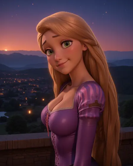Will generate Images of Rapunzel. The lora was trained with several outfits you can try some below.