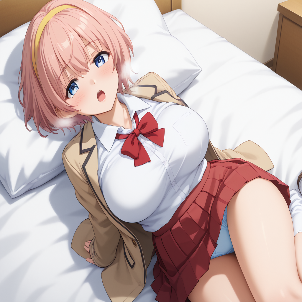 津原遥:haruka,粉发,短发,浅蓝眼睛,黄色发带