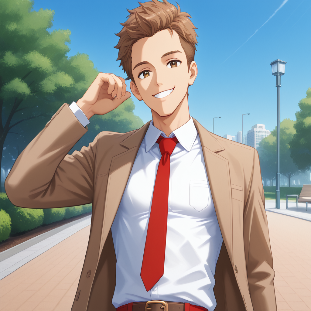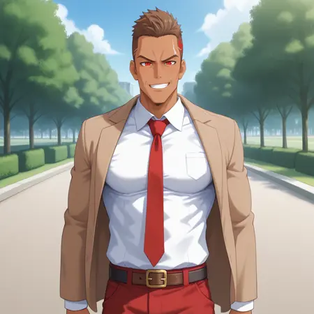 十文字一马:kazuma,棕发,板寸,红眼睛,皮肤非常黝黑,带着冷笑