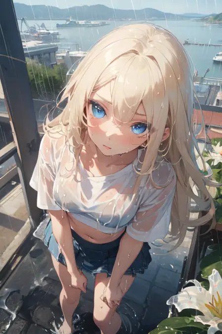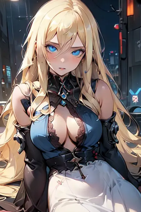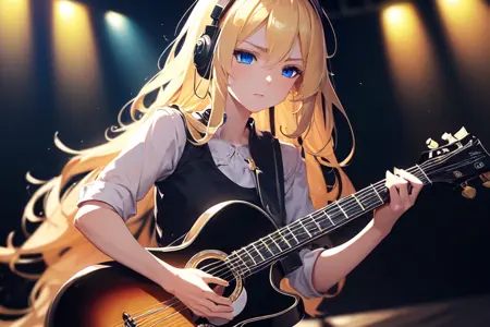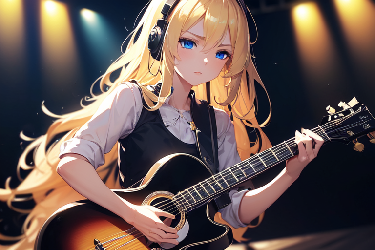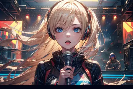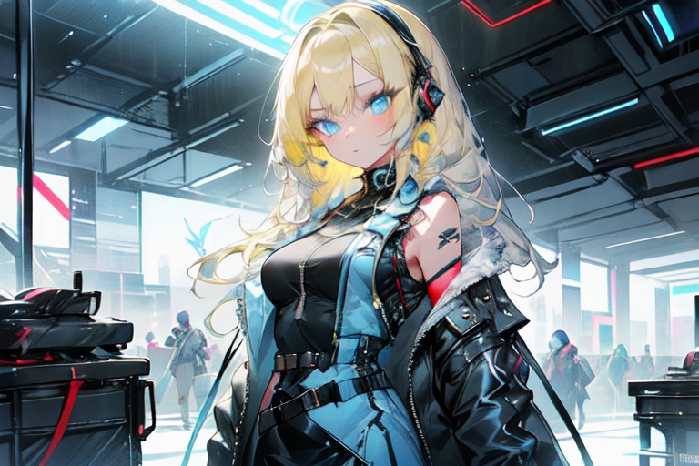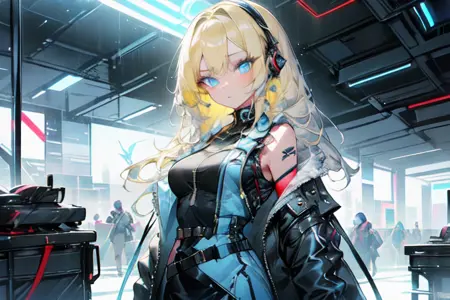 lily, long blonde hair,blue eyes,ears covered by a pair headphones. black and yellow, sleeveless, unzipped overcoat, light blue and white skirt, black and yellow high-heeled boots.
