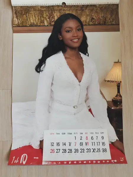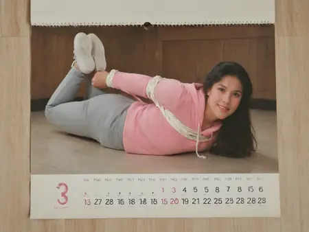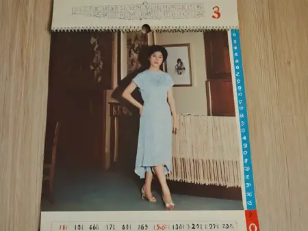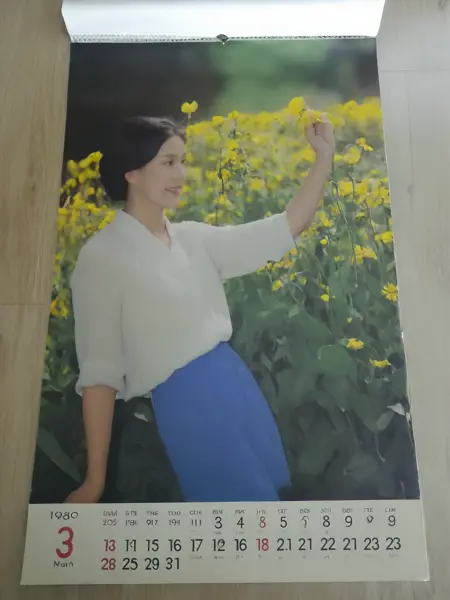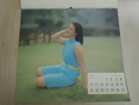 밝은 나무 질감의 표면 위에 오래되고 연대감 있는 캘린더가 놓여 있으며, 캘린더 가장자리는 약간 손상되었습니다. 그림 속 여성은 실외 장면에 있으며, 밝고 부드러운 조명이 비춥니다. 캘린더 내 이미지 화질은 선명하며, 아래쪽에는 1989년 9월의 캘린더 페이지가 표시되어 있으며, 영어 및 중국어 날짜가 표기되어 있습니다.