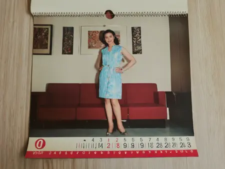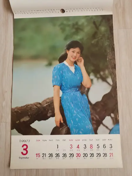 An old-fashioned calendar placed on a surface with light wood texture, the edges of the calendar are slightly damaged, a woman in the picture, outdoor scene, bright and soft light, clear image quality in the calendar, the calendar page at the bottom shows September 1989, marked with both English and Chinese dates