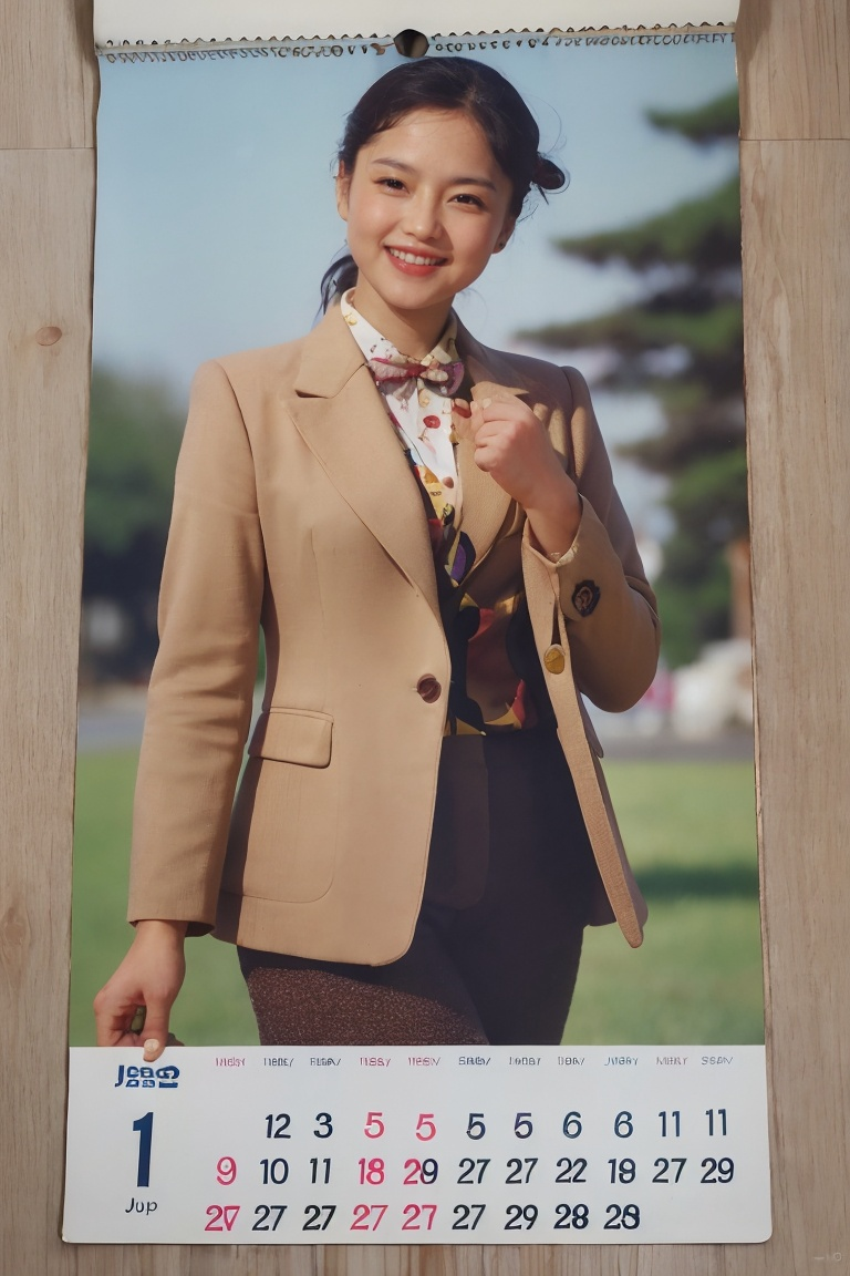 一张陈旧充满年代感的挂历置于浅木纹理的表面上,挂历边缘有轻微卷曲。画面中有一位女性,处于(可选择室内/室外/场景提示词),光线明亮且自然(可通过自然语言描述光线提示词),挂历内图片画质(可通过提示词描述画质情况,例如:清晰/模糊/复古/重影……),挂历下方的细节描述(例如:显示为 1985 年 7 月的日历页,标注有中文的日期和节日信息,底部有一些装饰图案)