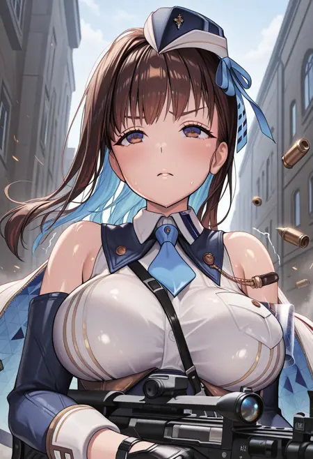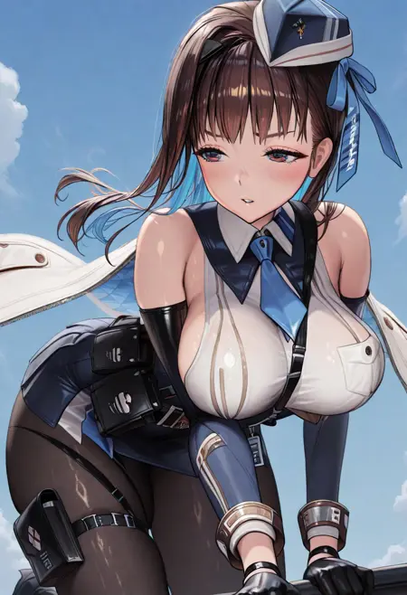 def_mariank963, garrison cap, blue headwear, black gloves, bare shoulders, blue necktie, sleeveless shirt, white shirt, collared shirt, detached sleeves, belt, black pantyhose, pouch, elbow gloves, white cape, blue inner cape, skirt, thigh strap, hair ribbon, blue ribbon, black footwear,