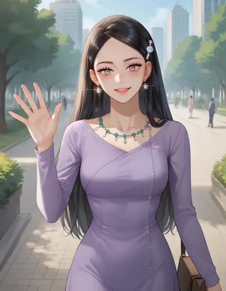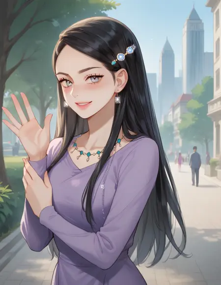 serena serenity, 1girl, solo, grey eyes, black eyes, long hair, black hair, long sleeves, purple dress, dress, necklace, earrings, hair ornament, hair behind ear,