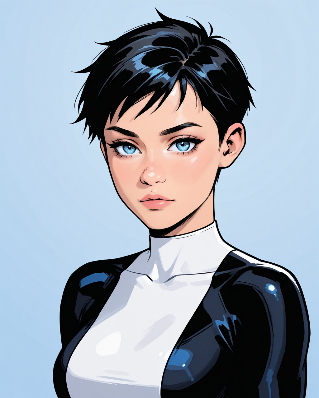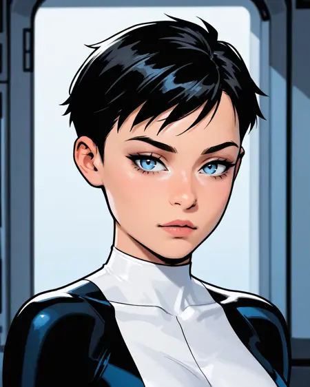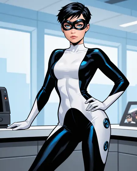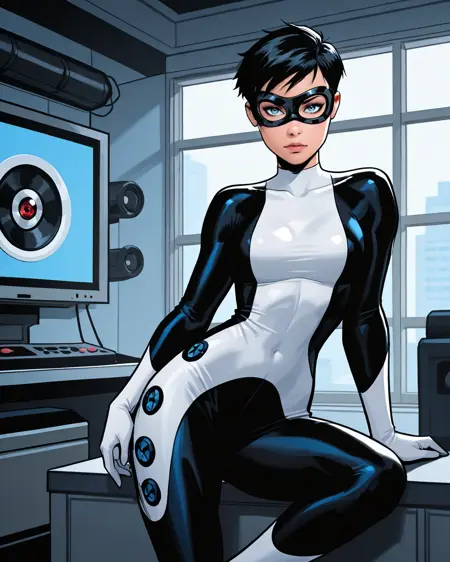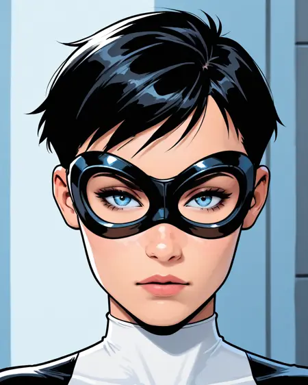 トリガー: _f1nesse、短い髪、黒髪、青い目、ボディスーツ、ドミノマスク