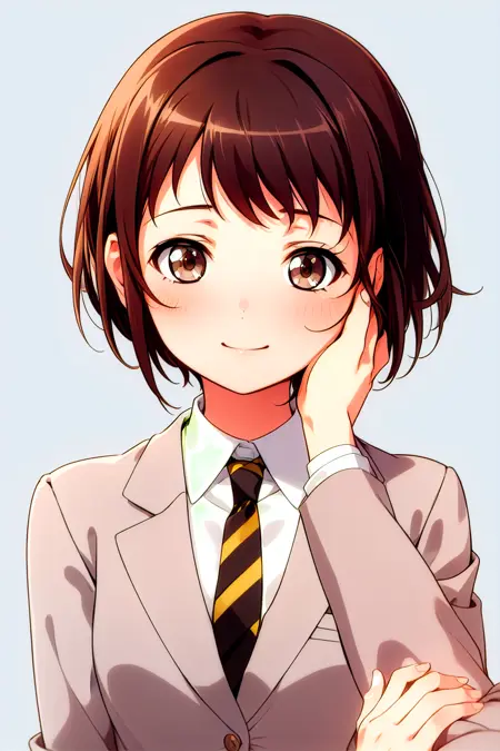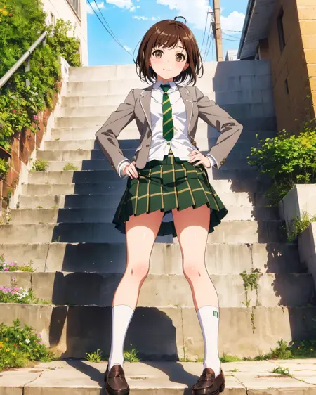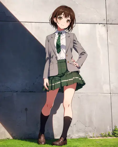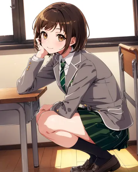 key:hazawa tsugumi,white background,,hazawa tsugumi, brown hair, brown eyes, short hair, necktie, (grey jacket:1.2),green necktie, striped necktie,green skirt,plaid skirt,white shirt,