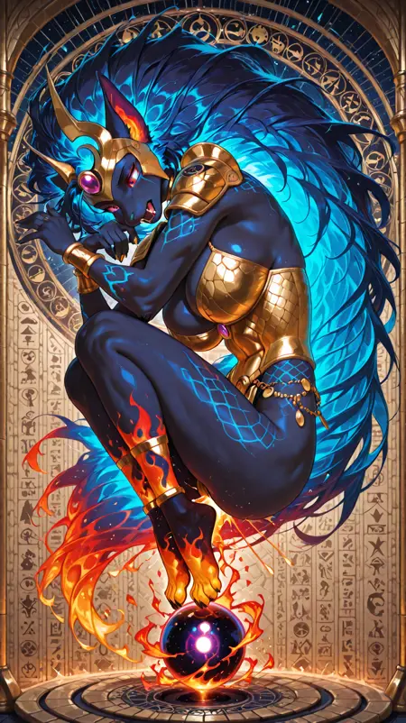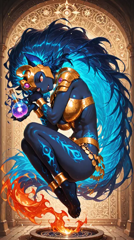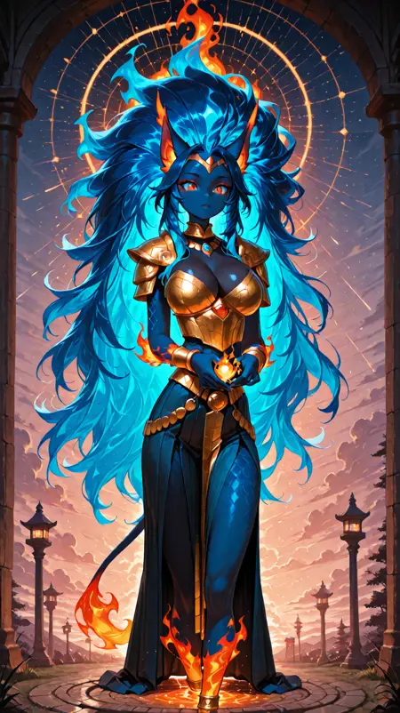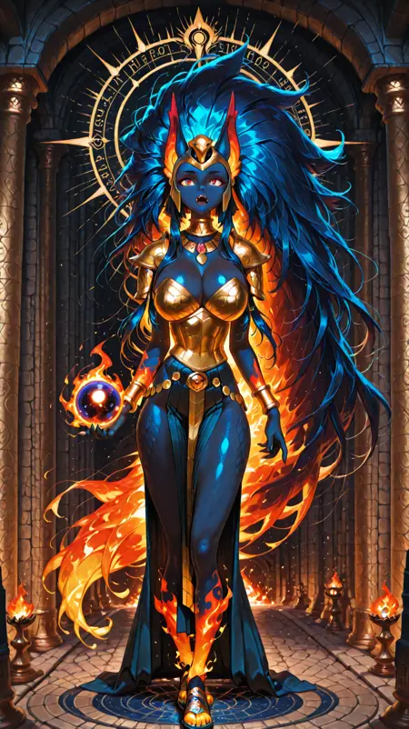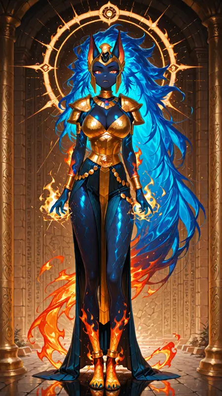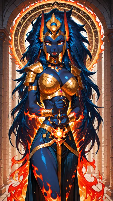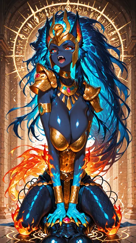 colored skin, blue hair, shoulder armor, animal ears, blue skin, jewelry, fiery hair, big hair, queen from ancient egypt,jeweled,bracelets, helmet, very long hair, (dark blue body, flame body), claws, fangs, fiery_body,furry female,