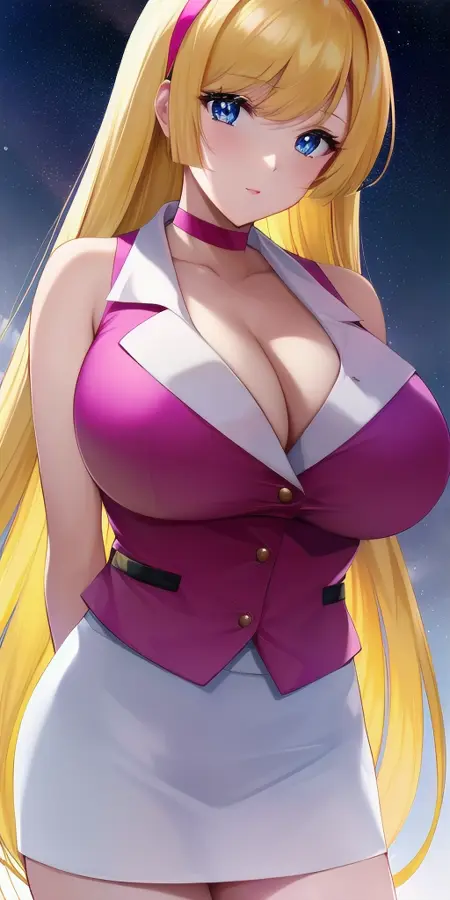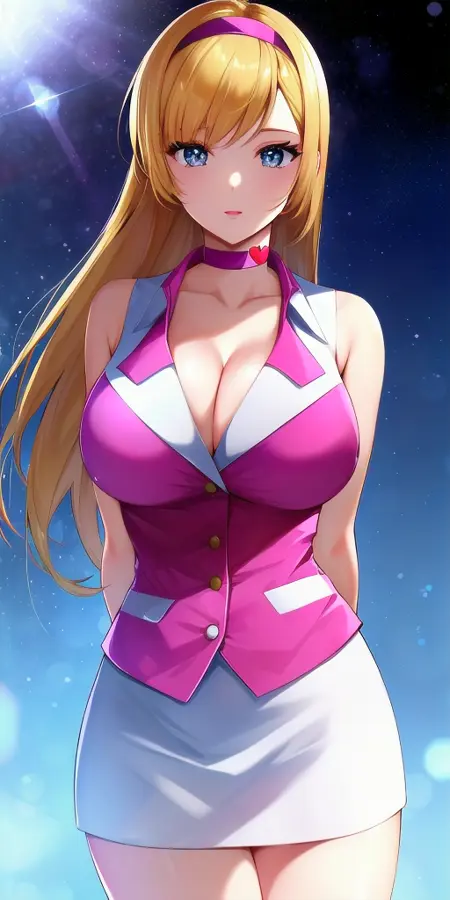 • pink_collared_shirt_cleavage_sleeveless_buttons_white_pencil_skirt_heart_choker_arm_ribbon: Her shin cutie honey outfit.